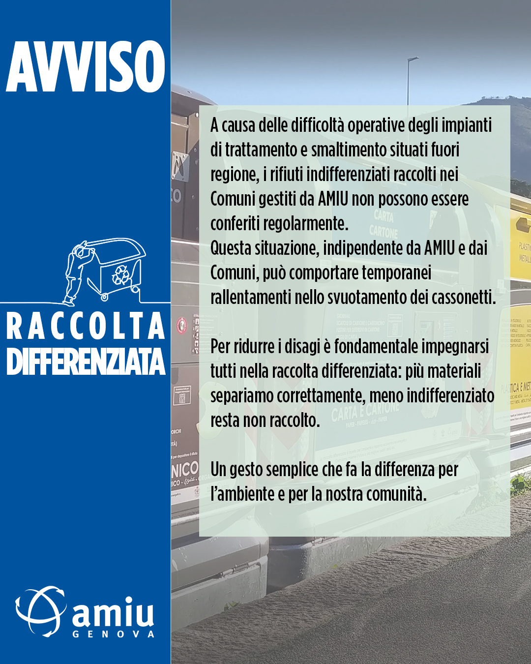 A causa delle difficoltà operative degli impianti di trattamento e smaltimento situati fuori regione, i rifiuti indifferenziati raccolti nei Comuni gestiti da AMIU non possono essere conferiti regolarmente. Questa situazione, indipendente da AMIU e dai Comuni, può comportare temporanei rallentamenti nello svuotamento dei cassonetti. Per ridurre i disagi è fondamentale impegnarsi tutti nella raccolta differenziata: più materiali separiamo correttamente, meno indifferenziato resta non raccolto. Un gesto semplice che fa la differenza per l’ambiente e per la nostra comunità.